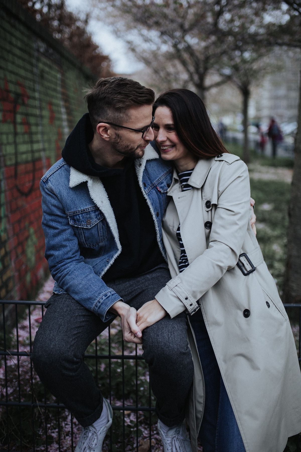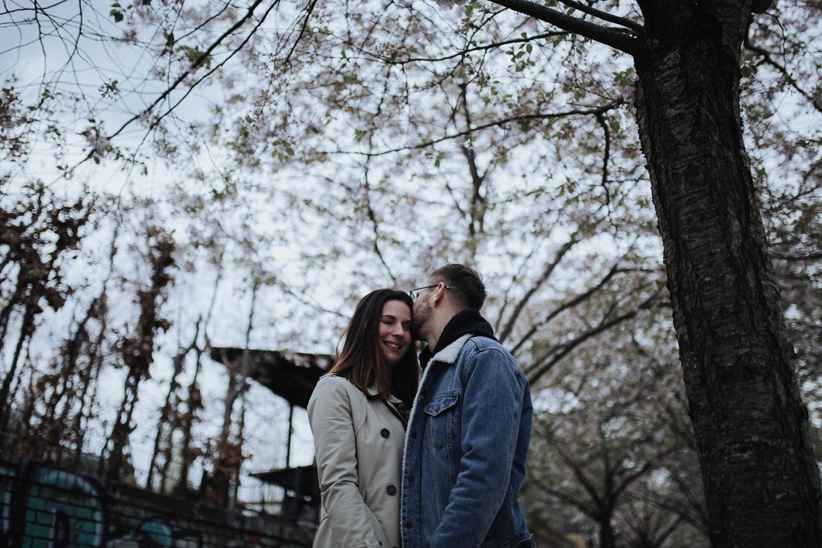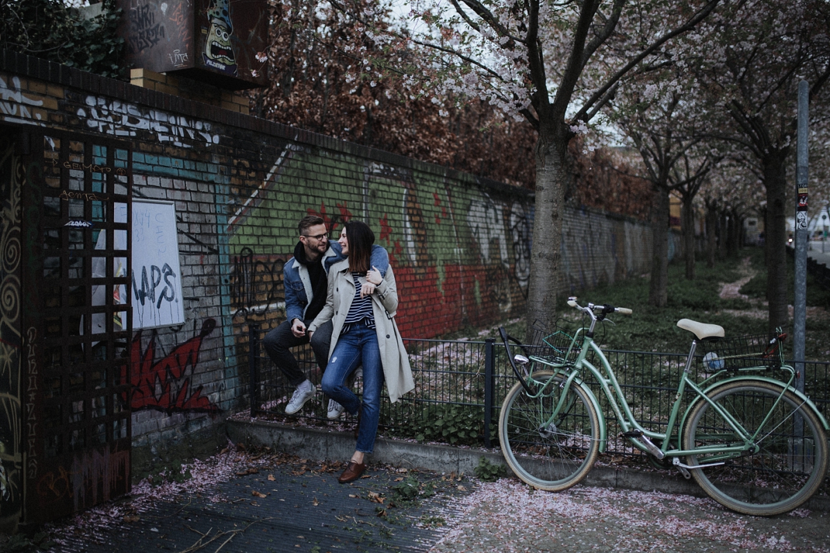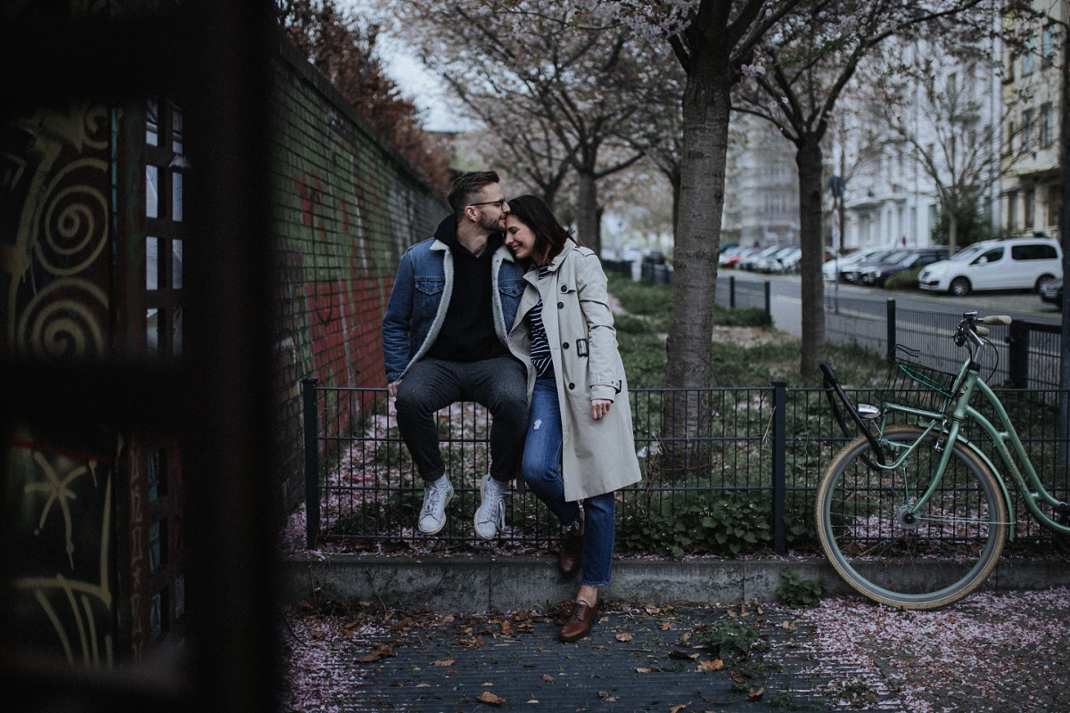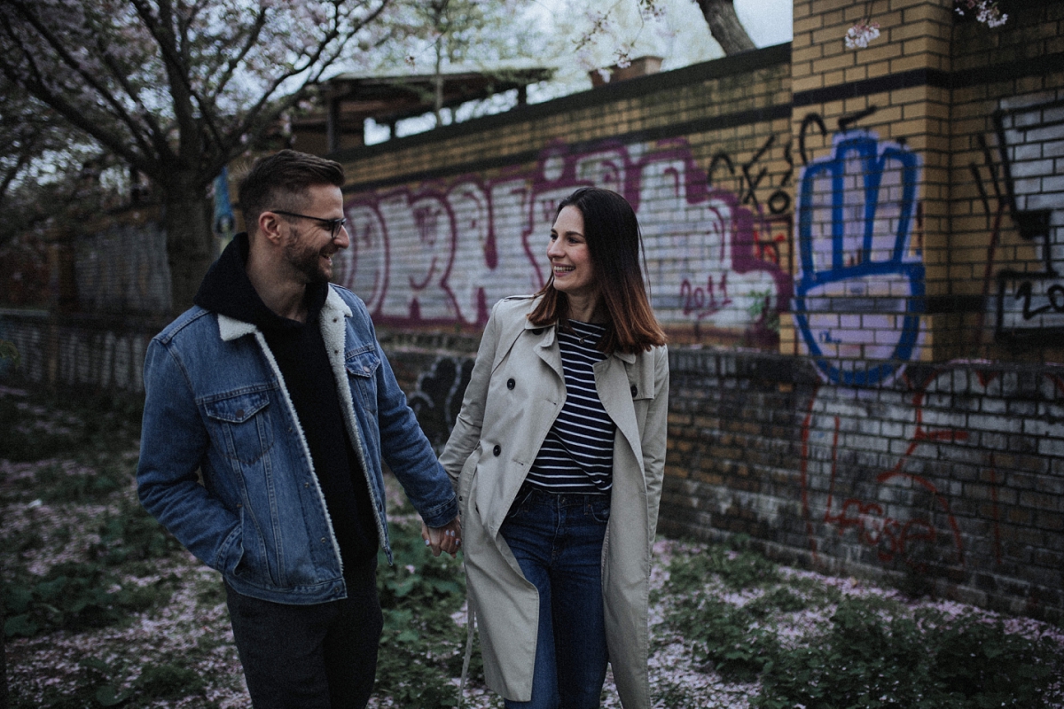 Im Frühling macht es mir immer besonders Spass, Paare in Berlin zu fotografieren. Während die Stadt weiterhin trist und grau ist, blühen die Bäume und bezaubern mit ihren bunten Blüten die Gemüter. So fiel die Entscheidung leicht, wohin ich Kristin & Stephan zu unserem Paarshooting entführen wollte. Direkt am Berliner Mauerpark gibt es einen Weg, nicht besonders lang aber dennoch ausreichend, um tolle Fotos zu machen. Da ich sonst eigentlich eher nicht so Fan von “Fotos mit Blüten bin” zeige ich euch heute meine ganze eigene Art ein bisschen Romantik in die Stadt zu bringen. Die Beiden bieten einem aber auch die perfekte Vorlage, mit ihrem lässigen Style und ihrem natürlichen Auftreten. Kristin selbst bloggt bei Insta unter dem Name ‘hatandflats’ und ist damit sehr sicher vor der Kamera. Aber auch ihr Liebster hat sich sehr, sehr gut geschlagen und ich hoffe für die Beiden ein paar schöne Erinnerungen an diesen schönen Tag festgehalten zu haben. Momentan warten wir ja noch immer auf gutes Wetter. Ich würde sagen, Zeitpunkt effektiv genutzt. Ich freue mich auf jeden Fall sehr über die Bilder und bin ganz verliebt in diese urbane Strecke.